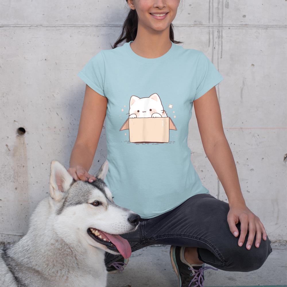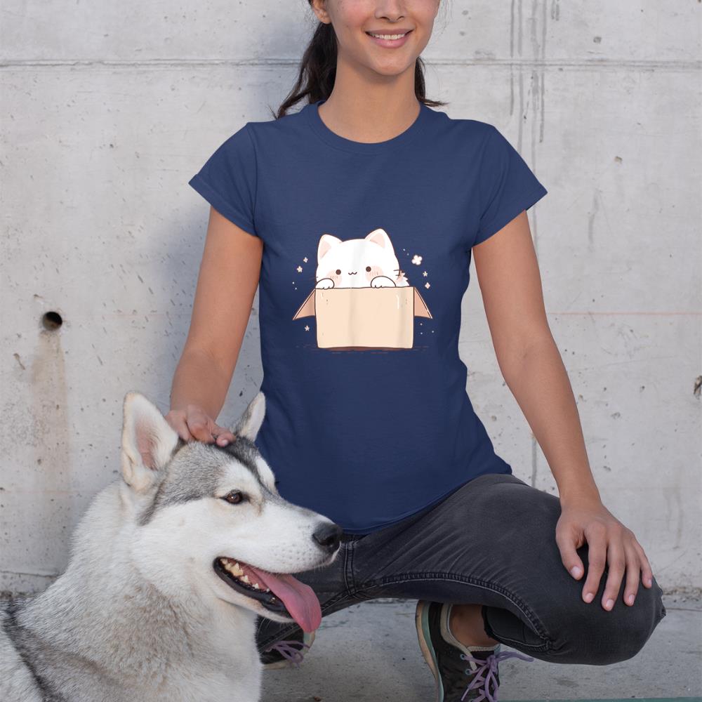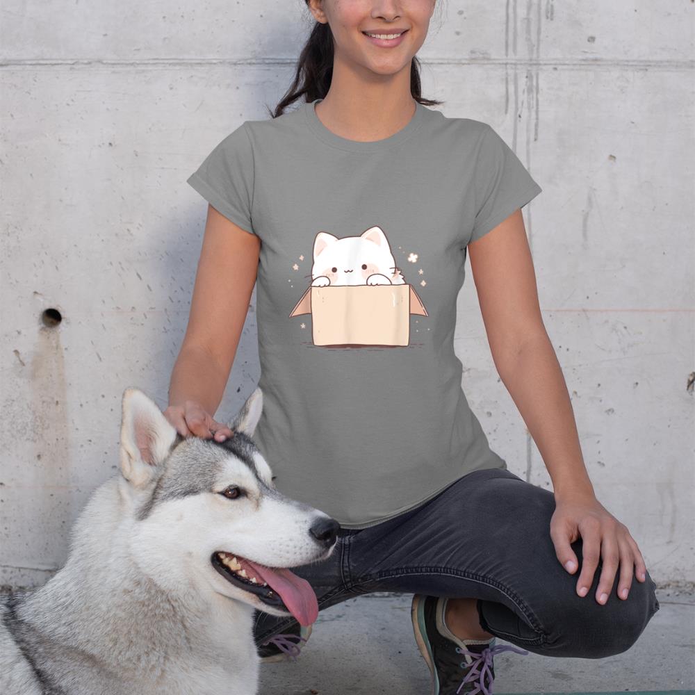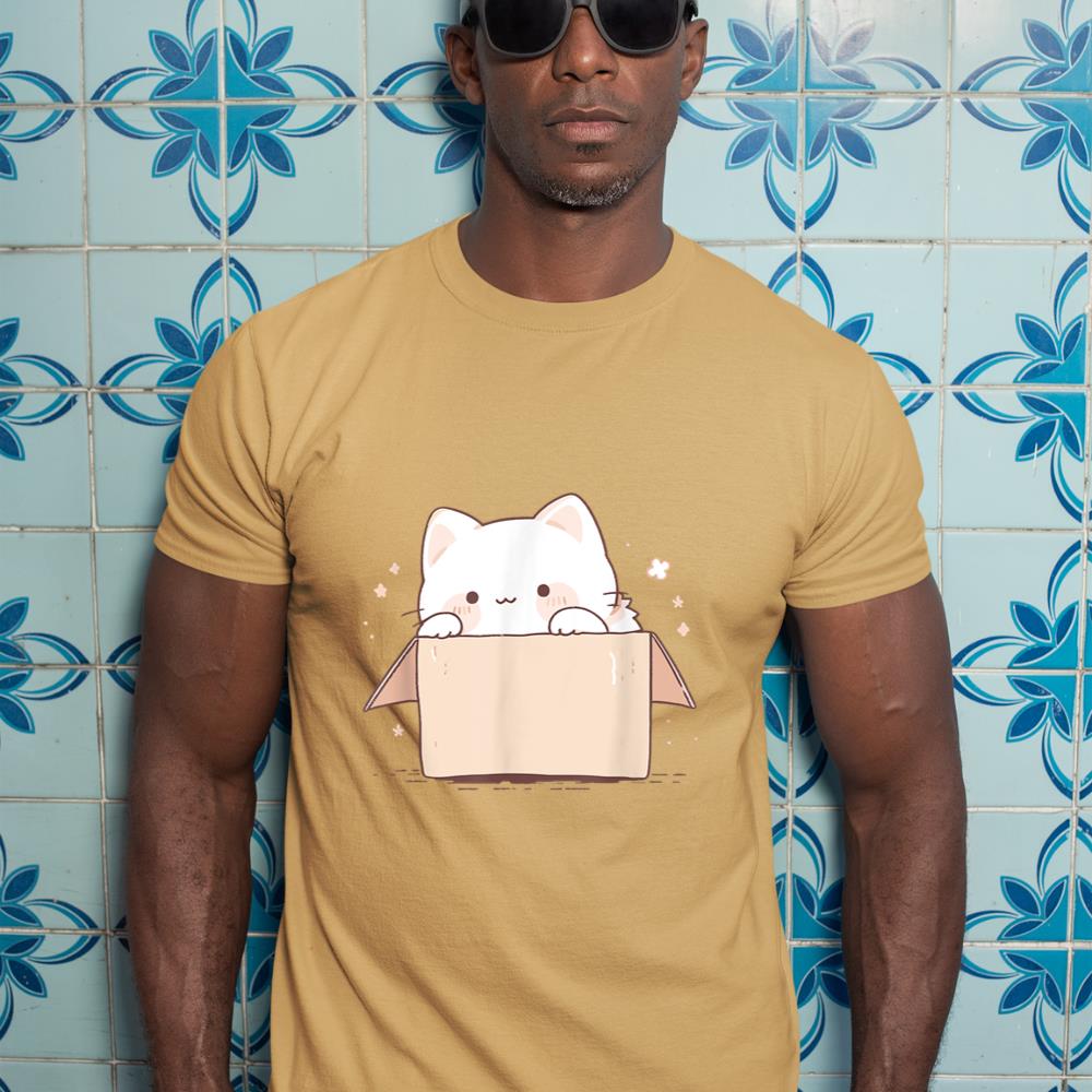 Cute White Cat in a Box Japanese Kawaii Cartoon Graphic T-Shirt