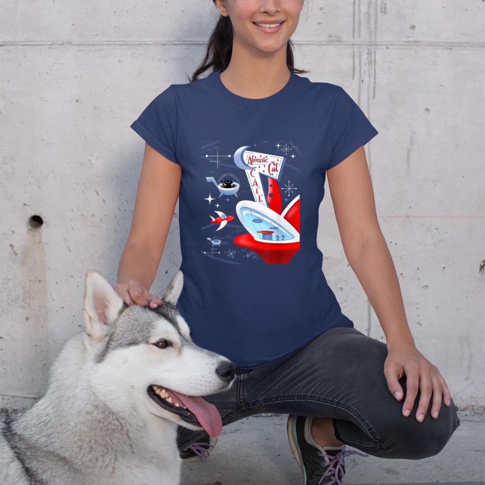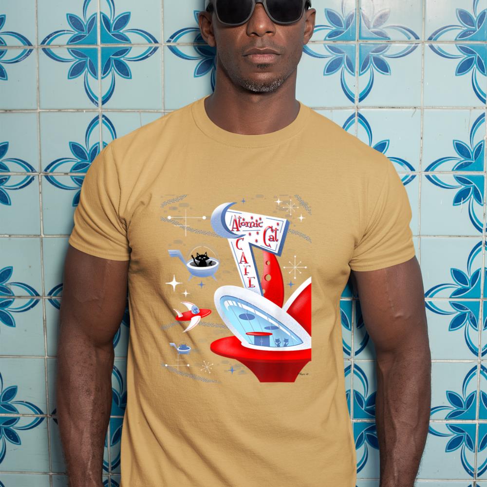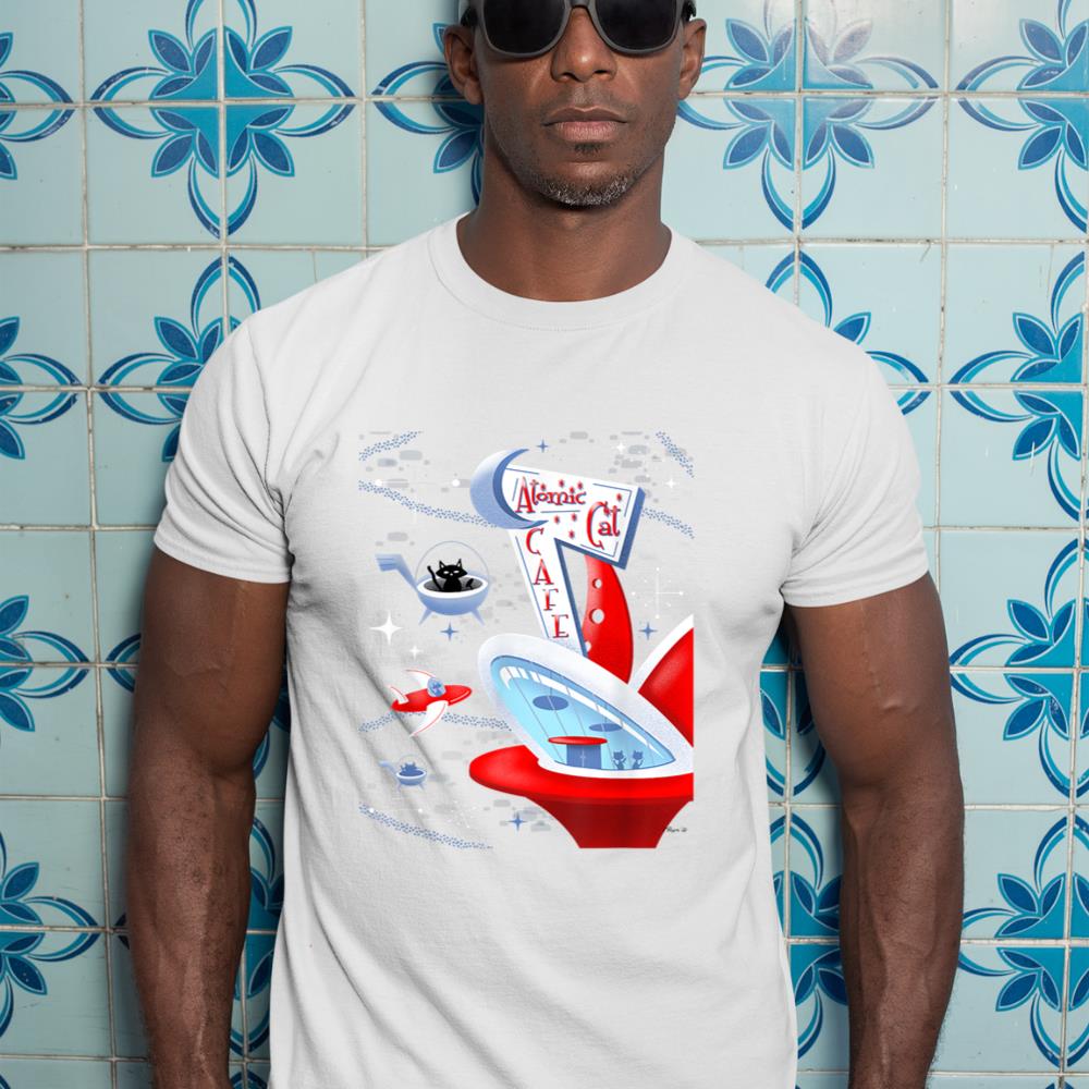 Funny Atomic Cat Cafe Retro Futuristic Spaceport Mid Century T-Shirt