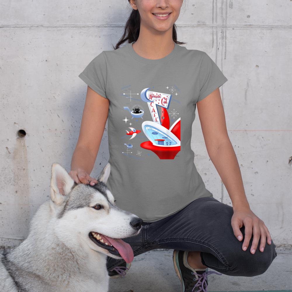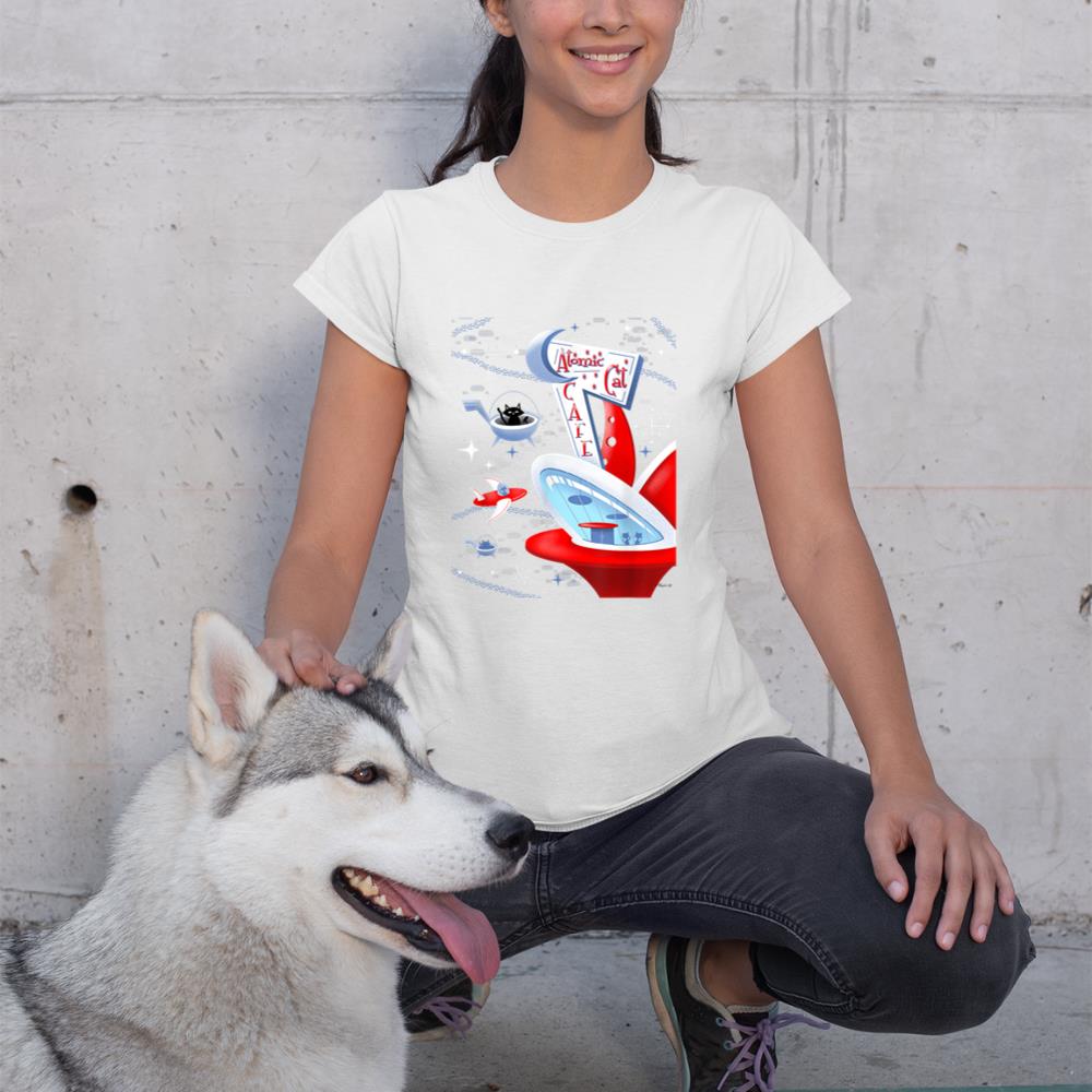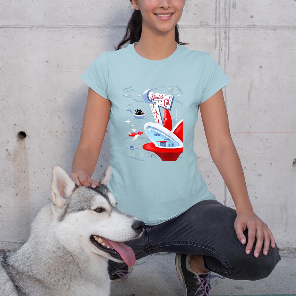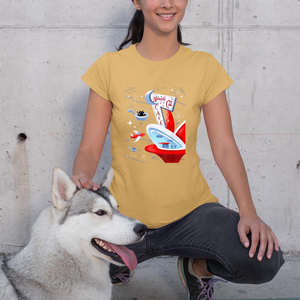 Funny Atomic Cat Cafe Retro Futuristic Spaceport Mid Century T-Shirt